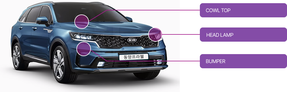 차량 전면부에 들어가는 부품을 만드는 제품을 소개합니다.