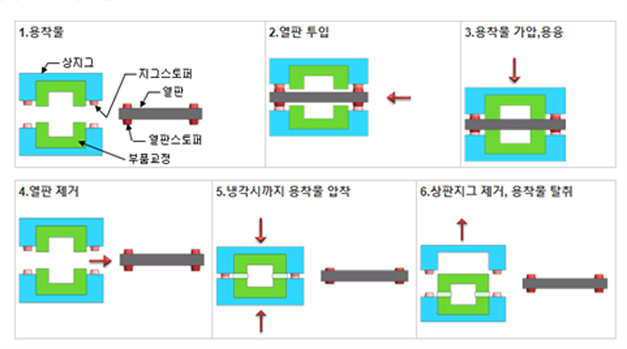 - 상하지그에 고정된 용착물이 재질의 용융 온도보다 약간 높은 온도로 가열된 열판에 의해 가열, 연화, 용융되는 원리
