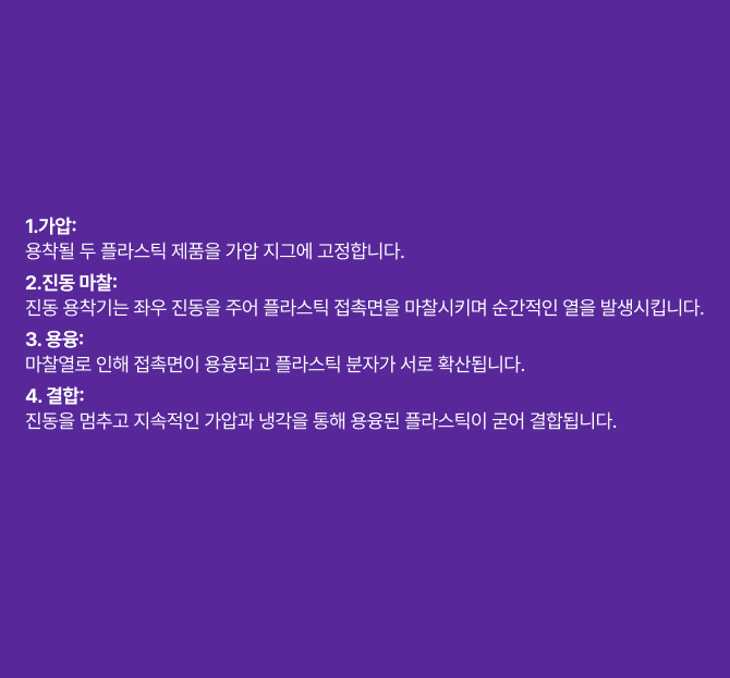 2. 용착면 마찰열 발생: 초음파 진동은 용착면에서 순간적인 마찰열을 발생시키며, 이는 재료를 녹이는 역할을 합니다.